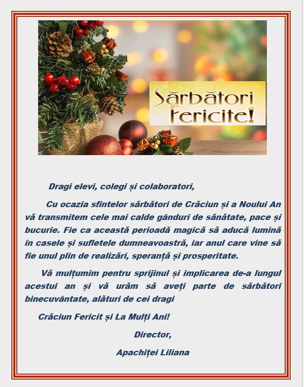 Școala asigură fiecărui elev condițiile pentru cea mai bună, utilă și completă dezvoltare în parteneriat și cooperare cu actorii sociali, promovând toleranța și înțelegerea între elevi.